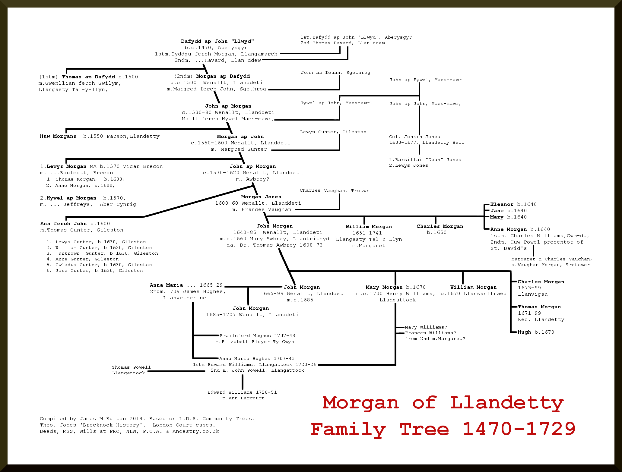 The family tree is primarily based on the work of others, with my own contribution & correction. Most trees state Morgan Jones d.1660 was the father of John Morgan d.1699, the evidence suggests otherwise. The extant wills of John's brothers Charles & Thomas also proved in 1699 name a John Morgan as being the father of John Morgan d.1699, and him having a will, however I find none such despite extensive searching in PRO, Ancestry, NLW, PCC, therefore this could be a nickname. They also mention an Aunt Jane and Uncle William, as scribed from Llanddeti M.I. by Theo Jones, being children of Morgan Jones and of having brothers Hugh and Thomas, NOT on that tomb. The Oxford Alumni also give John Morgan as father to Thomas & Charles, brothers (born c.1673) in 1690. The John who died in 1699 only had one son, John and mentions siblings Hugh, William and Mary, also mentioned in a 1717 court case. There is also an MSS in the British Library written by Thomas Hugh c.1668, related to the family, which supports my version of the tree, so not a correction after all, just an oversight by others. Therefore I insert a new generation here based on those original wills & documents.