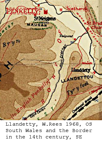 management as a Manor from an early date. Danywenallt, Pantywenallt & Upper & Lower Wenallt farms are suggestive of this, and may even have been a split through Welsh inheritance laws called 'gavelkind' prior to 1536. W.Rees quotes mention of Wenallt in his compilation map of the 1300s, the document of which I am currently trying to locate Wenallt Map 1300, but mention is not found frequently until the 1500s. The literal translation of the name is white hill, no doubt taken from the hill fort of the same name. On a higher level gwen, the feminine of gwyn could be associated with goodness, cleanliness or distinguishment. You could even stretch it to be being associated with a Lady Gwen. The lord of the manor is always described as 'of Wenallt' but could well have been based at Llandetty Hall, although no history prior to 1650 is found for that house, so we may also consider the ruling families living and split between Upper and Lower Wenallt farms.