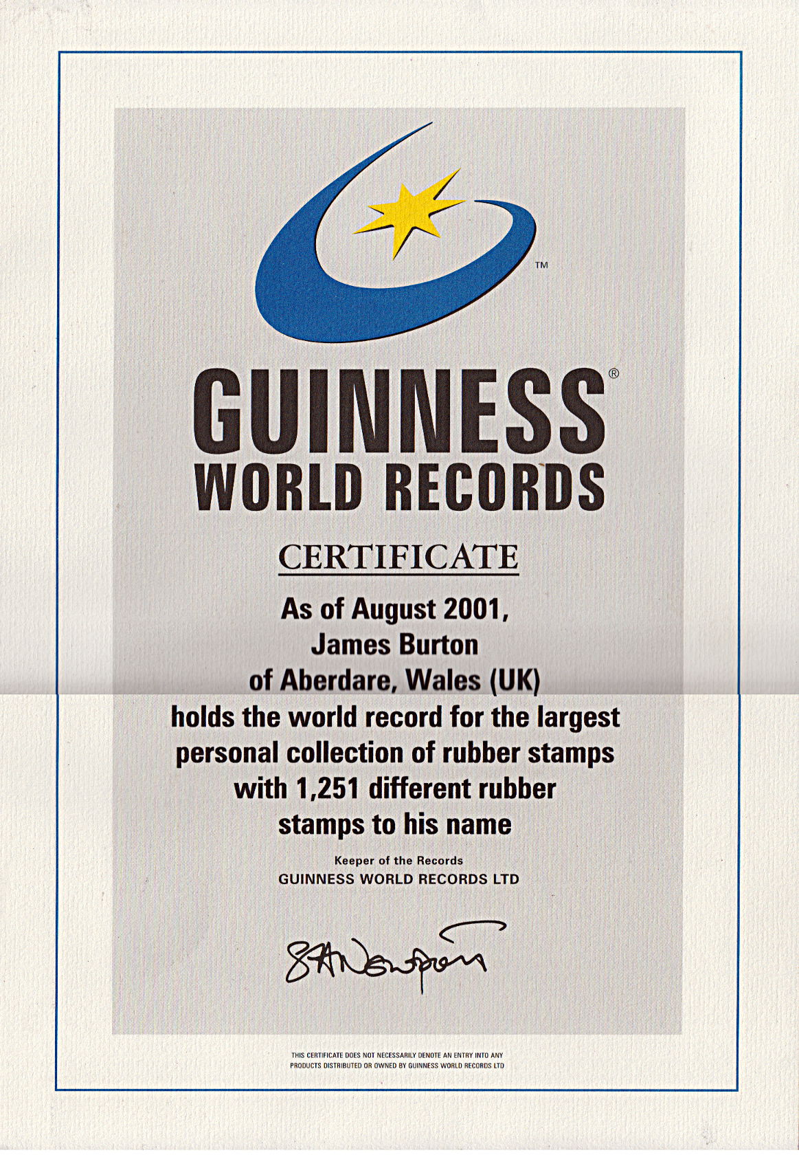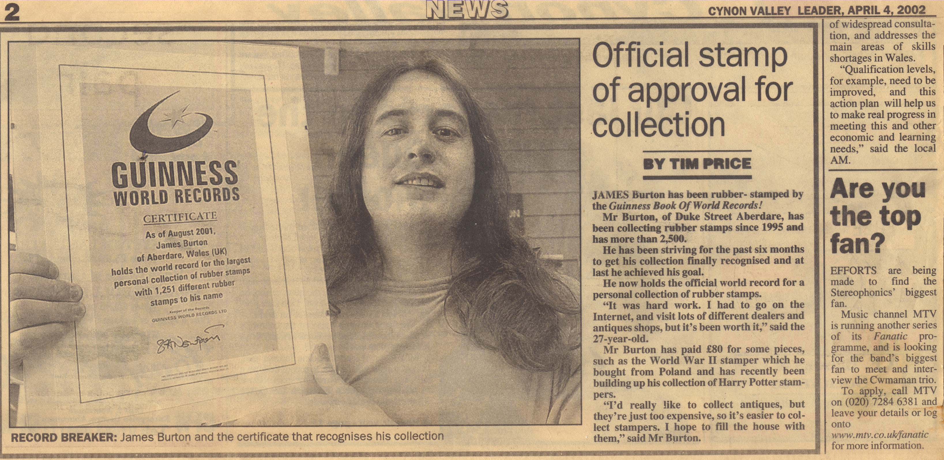 Spooksprings Guinness World Record Achivement! In 1989 I fixated upon a rubber stamp I saw a teacher using to approve some important document or other. I knew it had to be mine. The power it yielded to approve a persons acts seemed to beckon. Unfortunately for my karma and lust for power, I stole it. My diary notes of my turn of conscience by meaning to take it back. I'm not sure I did, but that single impulsive act seemed to become an obsession, almost an illness for me, when in 1993 I started the wholesale purchase of any rubber stamp that caught my eye. By 2000 I had a small and comprehensive collection and decided to take a leap into the annals of history by completing this childhood dream. Not as dangerous as bathing in a bath of snakes, but certainly a deed that required painstaking research and travel. I featured in a small 1/2 column of the 2004? Guinness World Record Album. I am indebted to the late John Styler, mentor and upper class professional who witnessed the collection and suffered the fallout from my mania with humor and dignity at the time. Click HERE for listing and pictures of the entire collection as of 2001 ![]() ![]() ![]() Images by Aberdare Leader Copyright 2001. James M. Burton featured. |